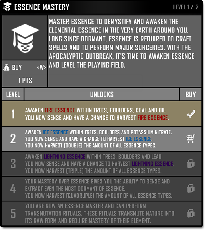 Base Essence is unlocked, and all Essence harvesting increased, through Essence Mastery. Higher tiers of Essence unlock through their corresponding Element Mastery (ex. Fire Mastery).