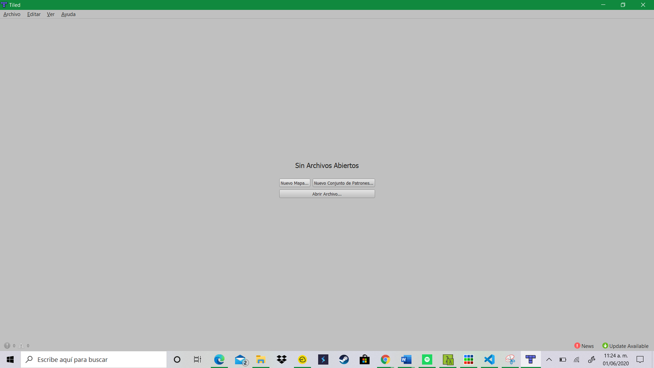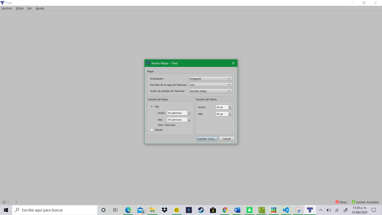 - Abrir Tiled y seleccionar la opción para crear un nuevo mapa.