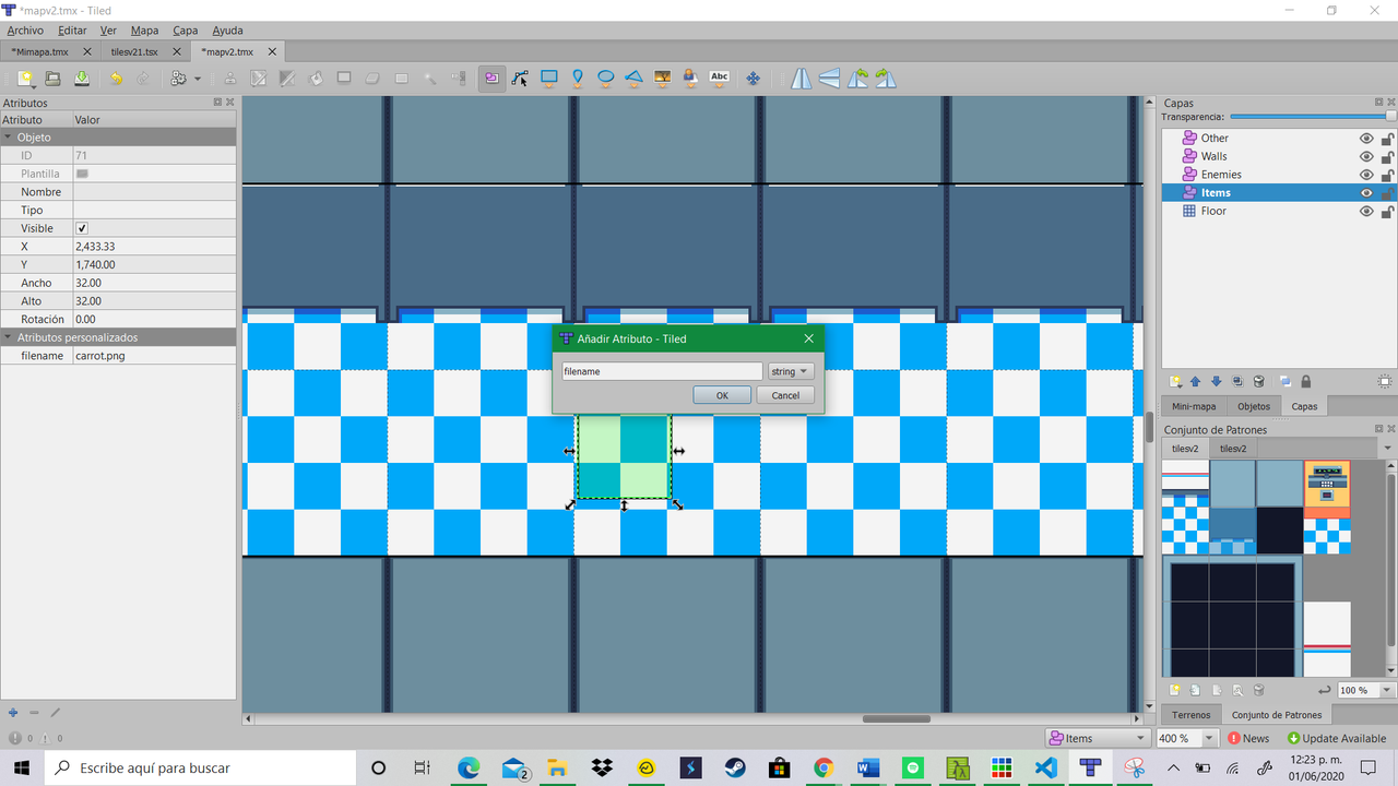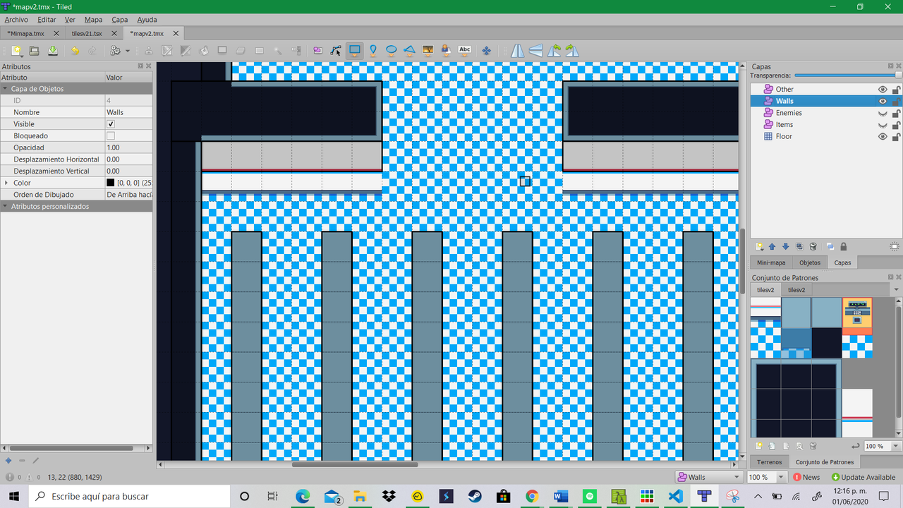 - Al terminar se va a mostrar una pestaña con el tileset, solo la cierran y regresan a la pestaña del mapa para empezar a editar