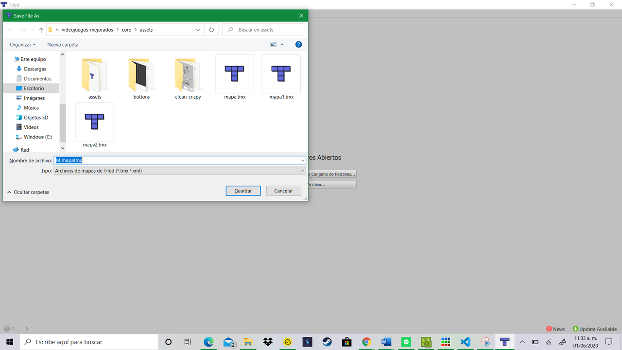 - Por comodidad, guarden el archivo del mapa en la carpeta de assets del proyecto (videojuegos-mejorados/core/assets), también puede ser en una carpeta dentro de assets, pero no fuera.