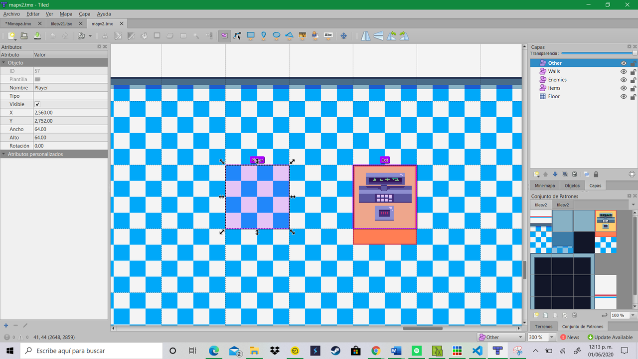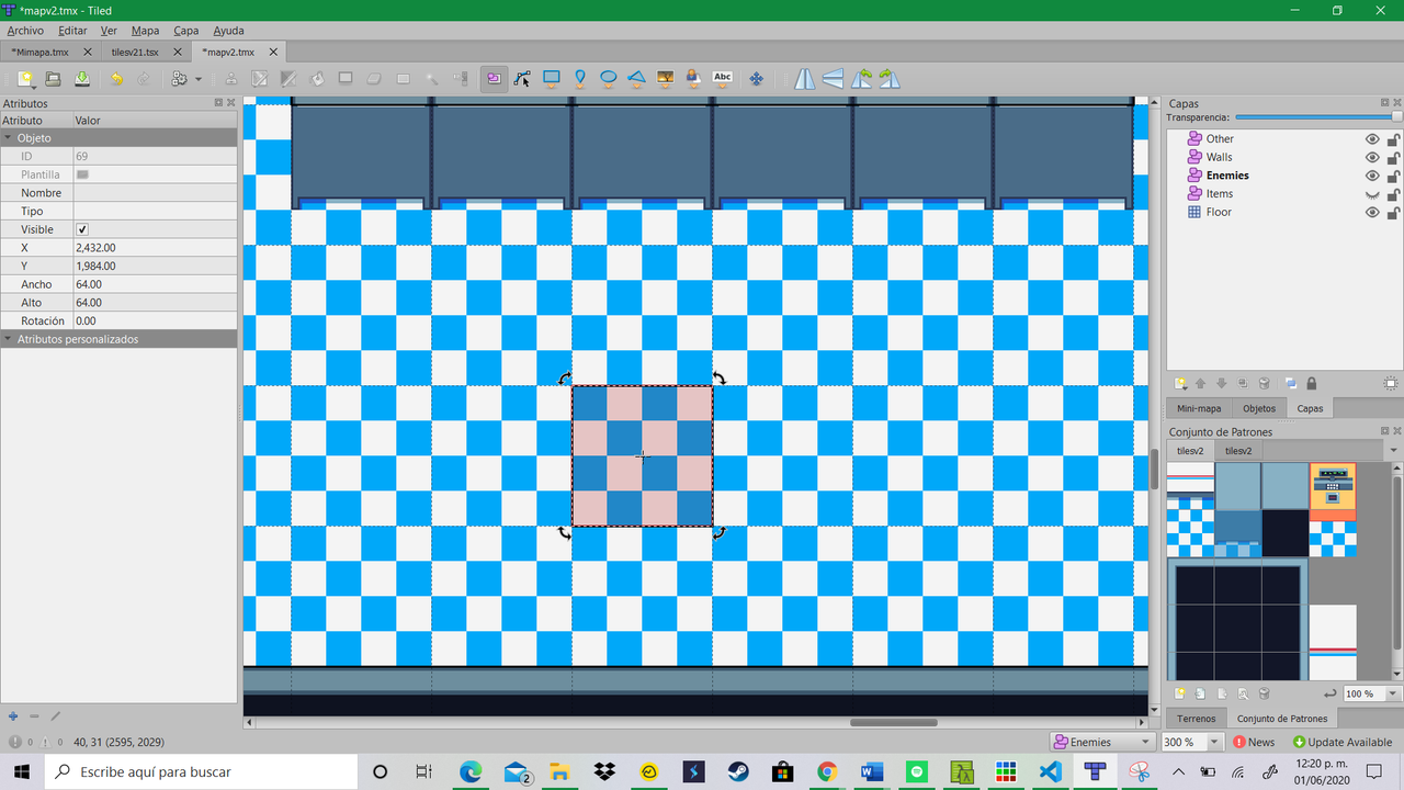 - Todas estas marcas se hacen a través de rectángulos (evitar usar otras formas, se tienen que programar funciones para detectar colisiones con otras formas) con la herramienta de insertar rectángulo de Tiled. También se pueden modificar con la opción de Seleccionar Objetos. Se puede presionar ctrl-l antes de dibujar al rectángulo para que las esquinas se alinien a la cuadrícula.