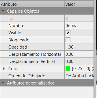 Es para marcar la posición inicial y los de los items que estaran en el mapa. Para crear un item es necesario crear un rectángulo del tamaño del item (32x32), aunque creo que no importa mucho el tamaño porque se toma la coordenada del punto superior izquierdo. Después de haberlo creado se tiene que añadirle un atributo personalizado usando el botón + en la parte de abajo de la sección de atributos. Este atributo tiene que llamarse "filename" y tiene que ser tipo string. Una vez que hayan creado el atributo el valor que le tienen que asignar es la ruta de la imagen del item, relativo a la carpeta de assets.