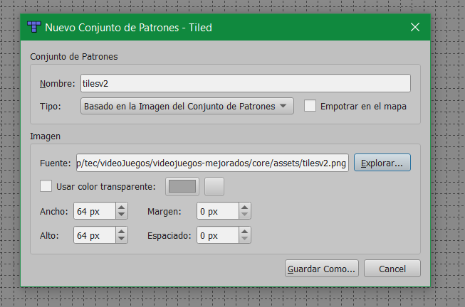 - Buscar la opción para crear un nuevo conjunto de patrones. En la fuente, buscar la imagen de los tilesets y asegurarse de que el tamaño es de 64px x 64px. Guardar el conjunto en la carpeta de assets.