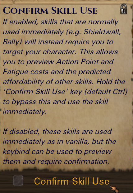In update 0.6.17 we added a keybind (default Ctrl) which you can hold while selecting a non-targeted skill to preview its use instead of triggering it immediately. This allows you to preview the costs of such a skill, e.g. Shieldwall, Take Aim, Rally the Troops, and the effects on your skill affordability, before using it. Then in update 0.8.0 we added a full-fledged mod setting which can be toggled on and off to change the default behavior from requiring confirmation or not. No more guess work or calculating whether you will be able to use another skill after using Shieldwall or Rally! You can just click the skill and the game will show you the affordability like any targeted skill.