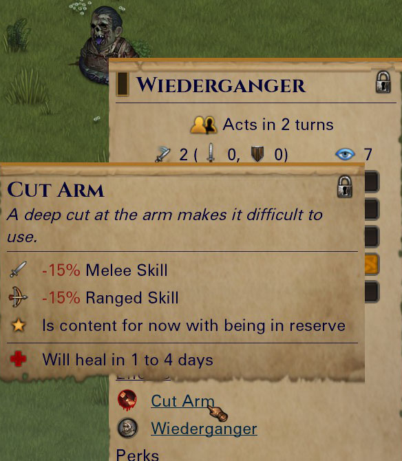 In the early versions of Reforged we added an interesting twist to the Crippling Strikes perk which allowed you to inflict injuries on undead enemies. These injuries were thematic to the enemies, so a wiederganger or skeleton got injuries that would make sense on them. However, in version 0.7.17 we have removed the Crippling Strikes requirement. Now, all undead can receive meaningful injuries from any damage, but they have a higher threshold for receiving injuries, so Crippling Strikes still helps.