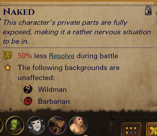 In our quest to counteract the most egregious cheesy things, one of which is going into Alp fights completely naked, in update 0.6.15 we added the "Naked" effect. This effect triggers during battle when not wearing any body armor and inflicts a 50% Resolve malus, as having all your private parts exposed puts in you in a rather nervous situation. Barbarians and Wildmen, however, do not suffer any penalties from being naked.
