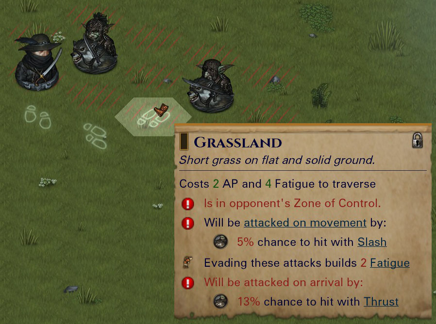 In update 0.7.17 we added a feature to show the predicted hit-chance of enemies surrounding you when you attempt to move out of zone of control. Similarly, when moving into the zone of control of an enemy using Spearwall. These hitchances are shown in the tooltip of the previewed movement tile.