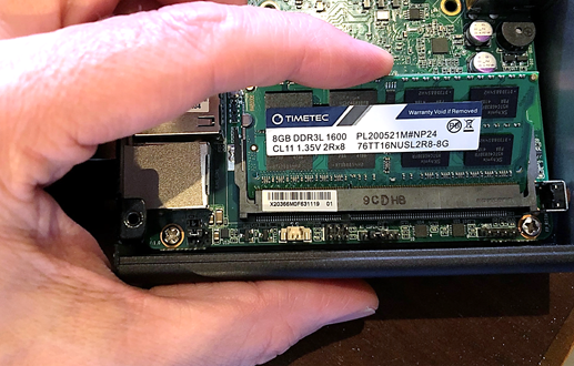 Take the new SO-DIMM and insert it at a 30 degree angle. This is the same angle as when the old card popped up.