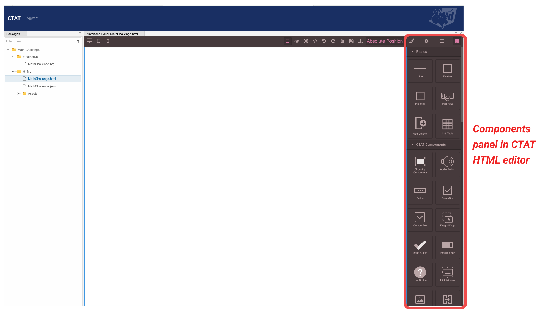 CTAT HTML editor: You start from an empty canvas with space for creating a general problem layout using drag and drop. You should make yourself familiar with all the components available to you in the left side panel so you can think of what is possible in the CTAT HTML Editor: CTAT HTML Component Overview