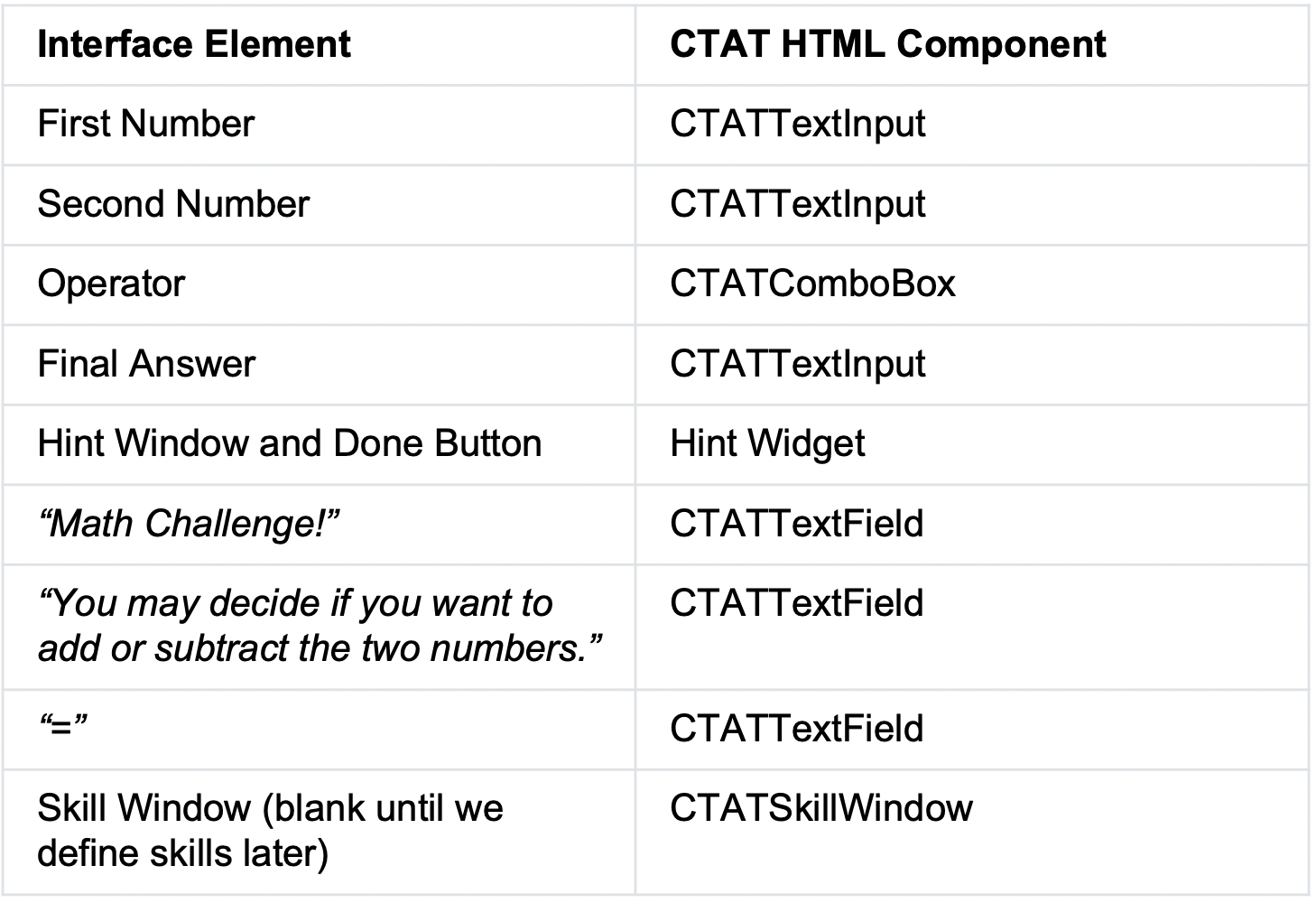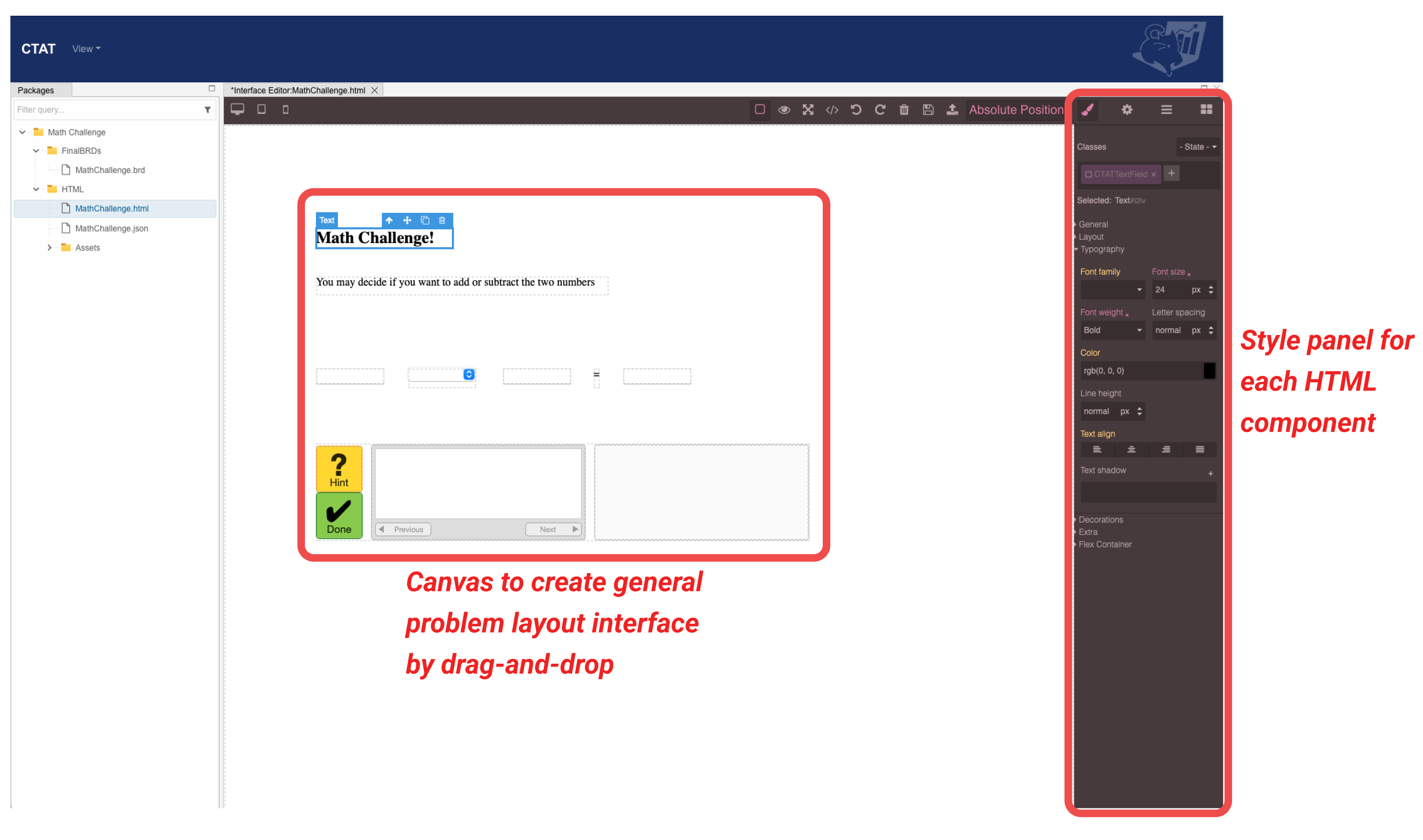 - Drag-and-drop interface building - the CTAT HTML editor lets you build an interface without coding, but the resulting interface is somewhat limited