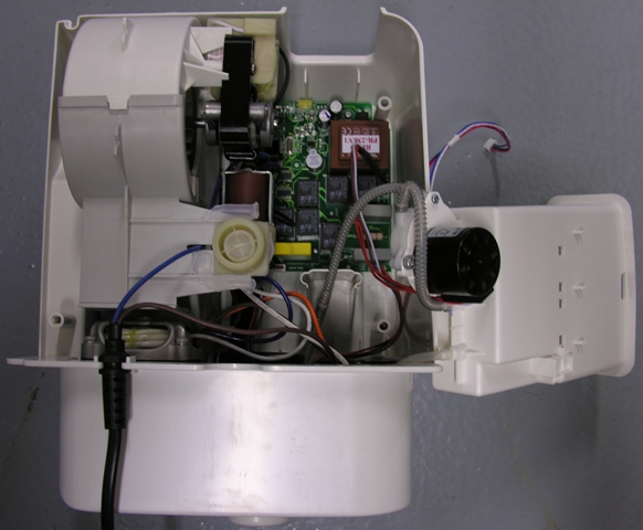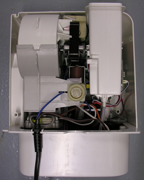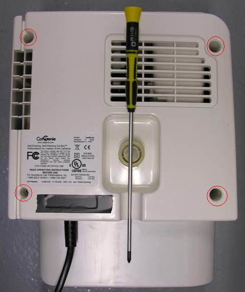 Take the PU from the base and disconnect the water hose at the end of the PU. The PU housing is constructed from three shells. The front shell, holding the GenieEyes cat sensor and the control panel. The rear shell, has air intake holes in it and a hole for the water intake. And the bottom shell, containing the cogs for the bowl, the scooper, the water sensor. etc. Put the PU on a towel in front of you with the front shell facing down and the bottom shell facing towards you. Be careful not the push the unit down too hard as this may push in the cat sensor face plate into the front shell, because this is only glued into place using hot melt glue.