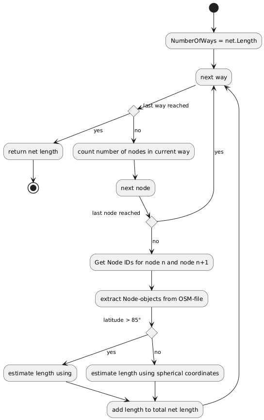 Für die Berechnung der Strecke einer Straße wurde eine eigenständige Klasse CalculateDistance angelegt. In dieser wurden zwei der oben aufgeführten Methoden zur Berechnung des Abstands zweier geographischer Koordinaten als EstimateDistancePythagoras und EstimateDistanceSphericalCoordinates umgesetzt. Diese beiden Methoden wurden lokal gesetzt. Von außen ist über eine Instant der erstellten Klasse nur die Methode CalculateNetLength ansprechbar, welche eine Schleife über alle ways eines Straßennetzes ausführt und entscheidet, welche der beiden Berechnungsgrundlagen für die jeweilige Auswertung eingesetzt werden soll. Hierbei ist der Abstand zu den Polen ausschlaggebend für die Entscheidung, ob mit Kugelkoordinaten gerechnet wird oder nicht. Der Aufbau dieser Methode ist im nachfolgenden Ablaufplan(Abb. 4) umrissen.
