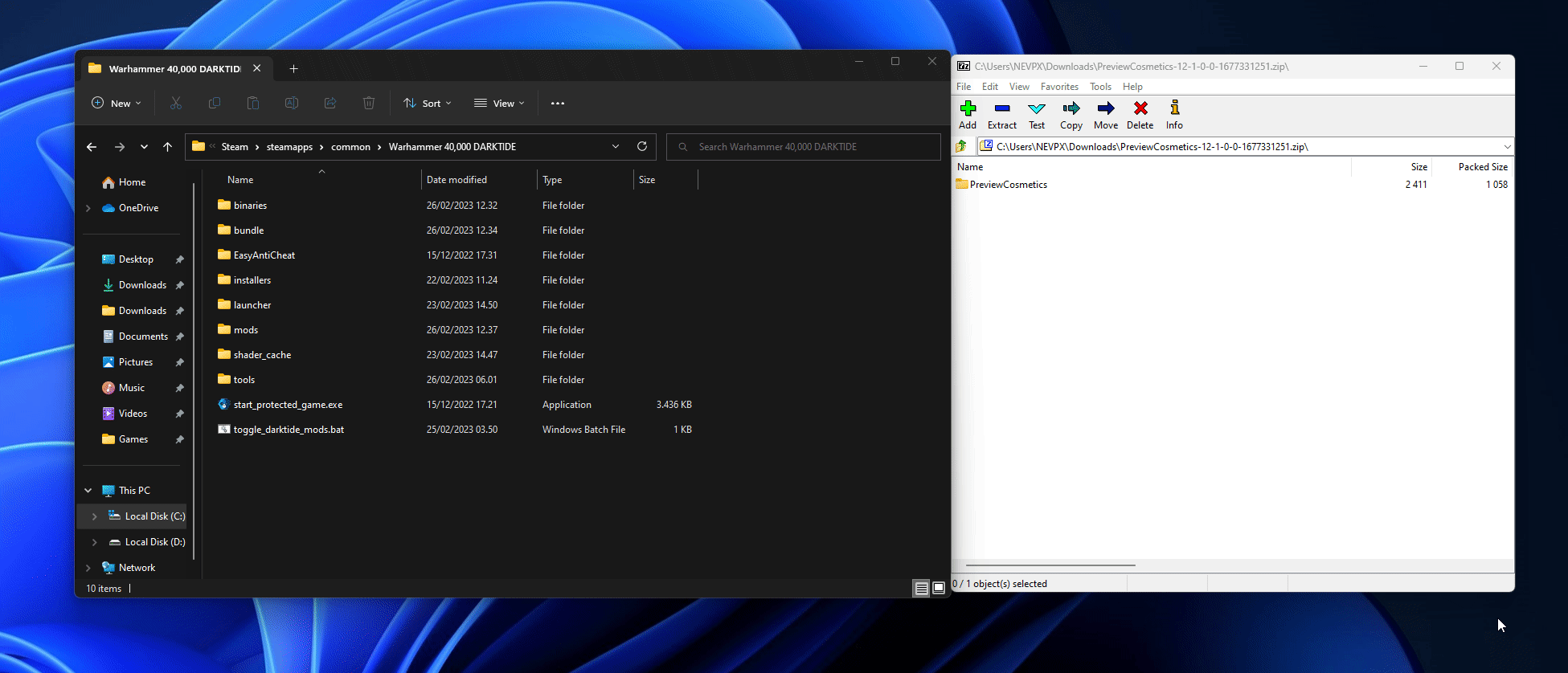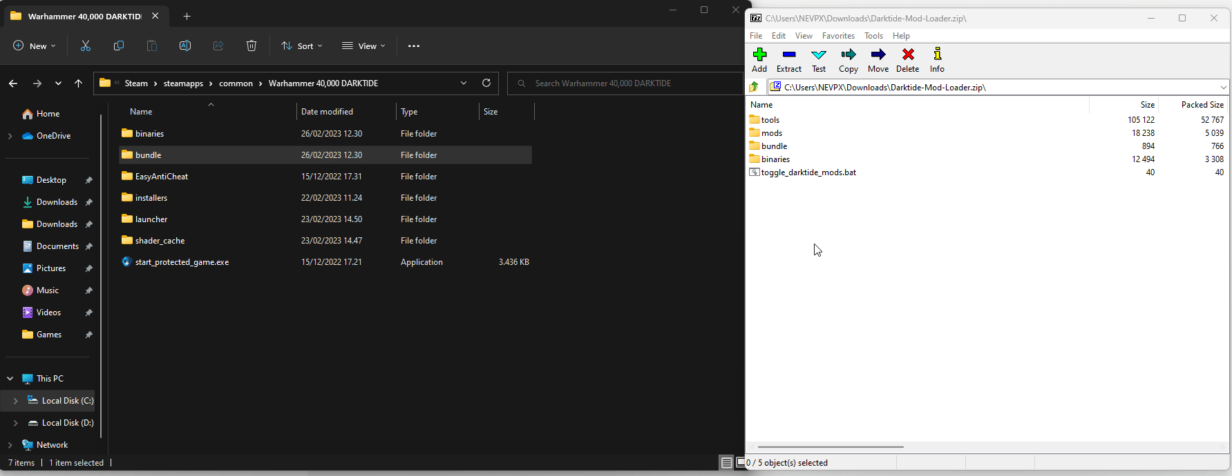 Open Darktide-Mod-Loader-xx-x-x-x.zip and extract all the files into your game folder. e.g. Steam\steamapps\common\Warhammer 40,000 DARKTIDE