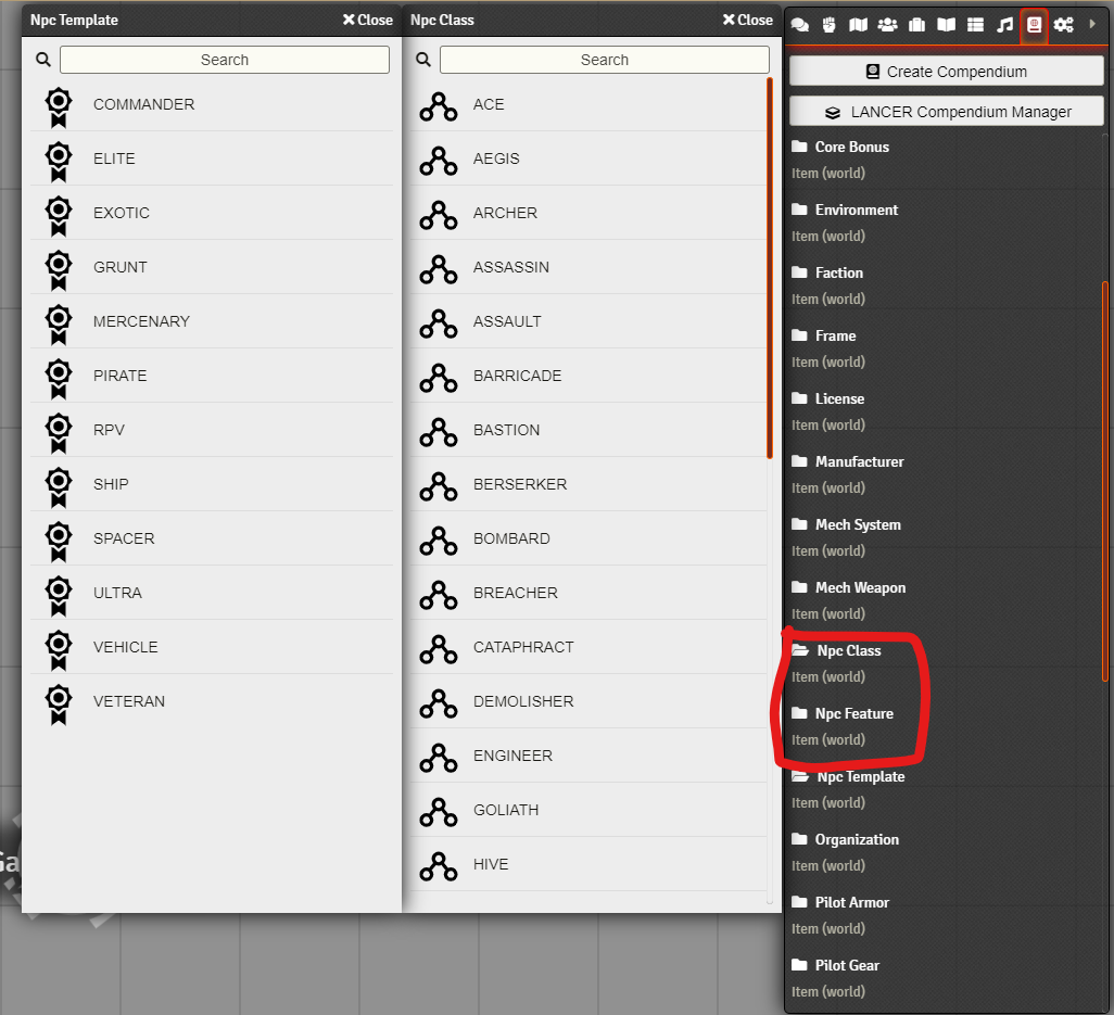 - Scroll down on the compendium's list and click on the "NPC Class" and "NPC Template" to open them.