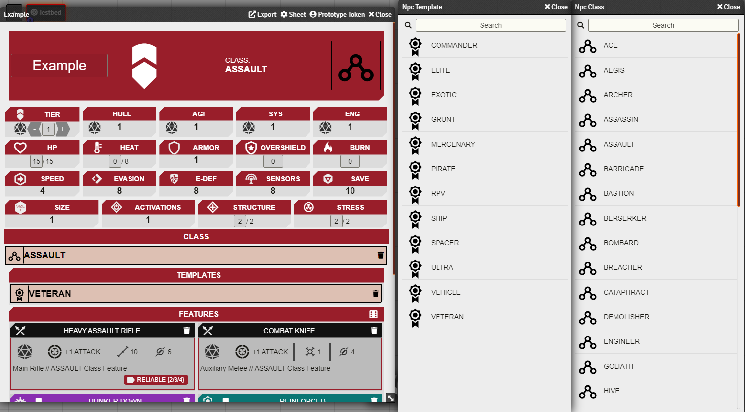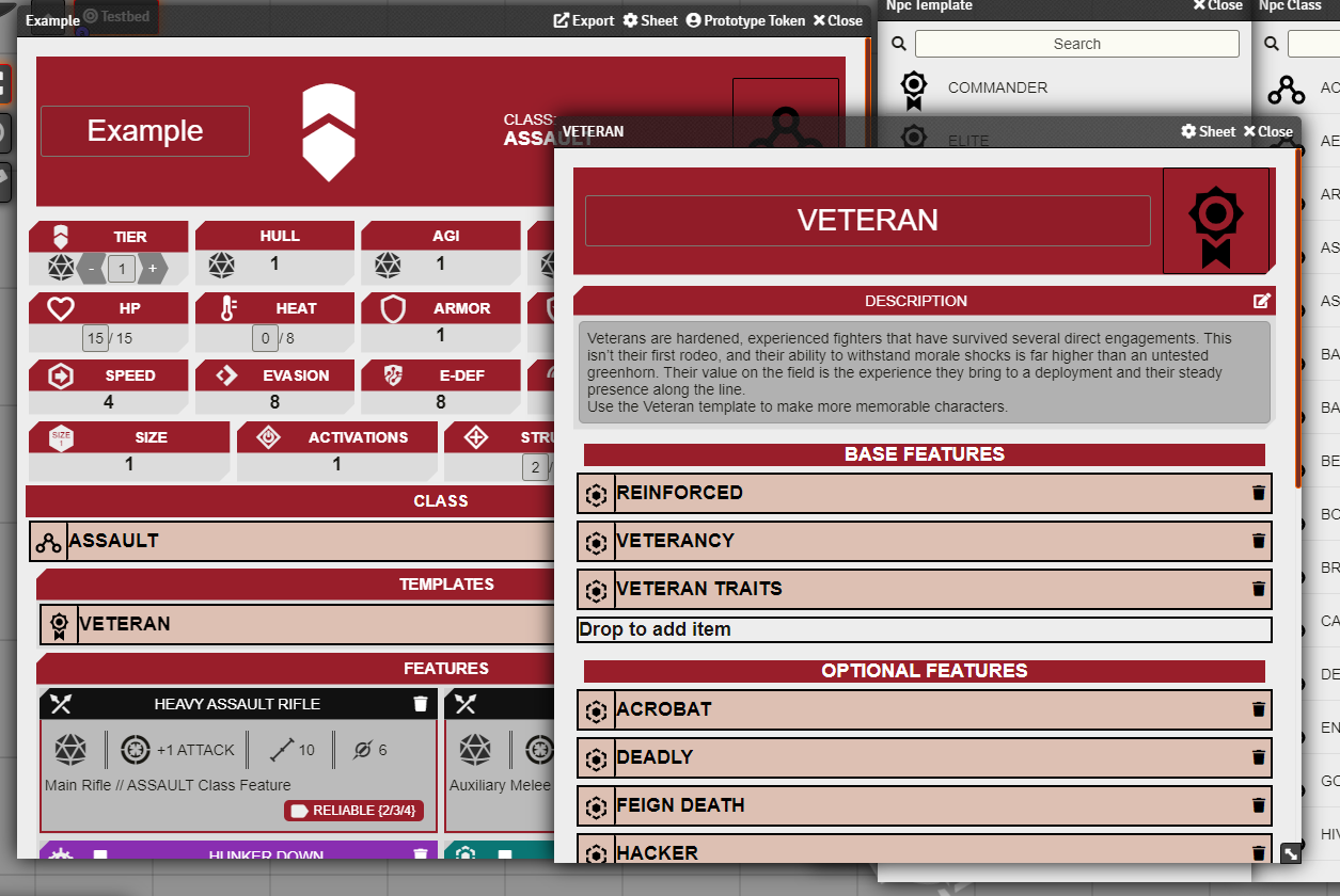 - Click and drag the desired class and template to the sheet. This will fill the sheet with the base stats, systems, traits and weapons.