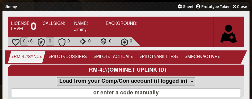 Go to the character sheet and select the “RM-4://SYNC” tab. Click on the dropdown box and select the Pilot you want to import. You cannot import pilots that are loaded as remote resources with this method - paste the Share Code into the dialog box instead.
