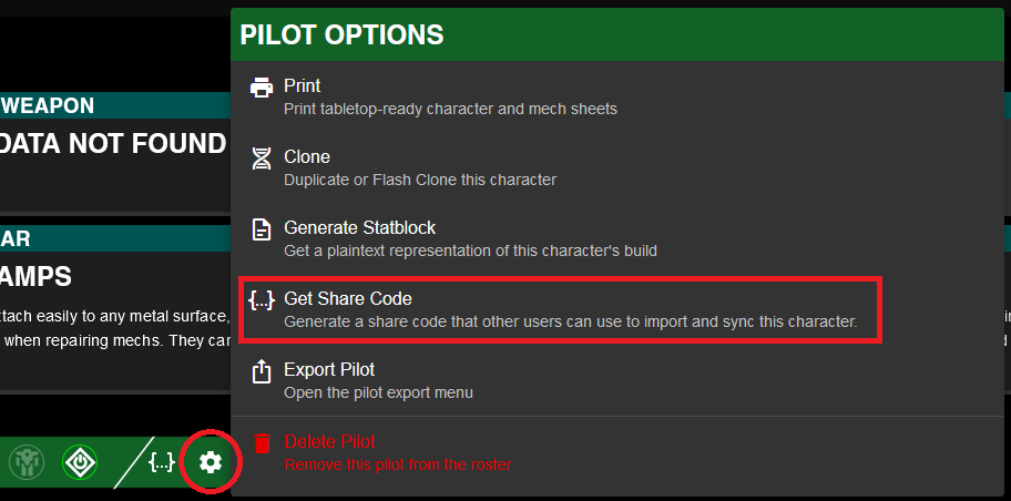 ℹ️ The Share Code is also available from the “Get Share Code” option in the cog menu on the Roster page or character sheet.
