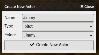Go to the “Actors” tab in Foundry and click the “Create Actor”. Enter a name and make sure the type is set to pilot.