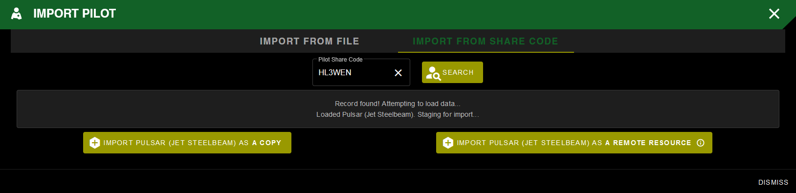 Choose “Import From Share Code”, then paste the Share Code into the box and click the “Search” button. Once the pilot data is loaded you will be able to choose between importing as a remote resource, or as a copy. If you want to import the pilot into Foundry via login, you will have to import as a copy.