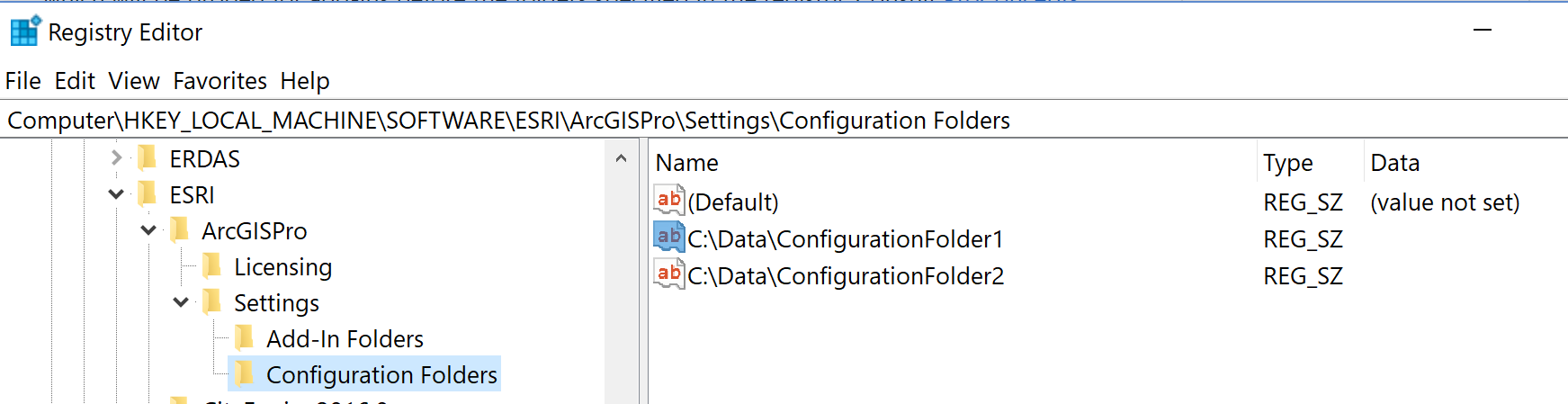 A string value (REG_SZ) whose value is the path to a local directory or share to search for configurations (.proConfigX). ConfigurationFolder will always be searched first before the default folder location at C:\Users\<UserName>\Documents\ArcGIS\AddIns\ArcGISPro\Configurations.