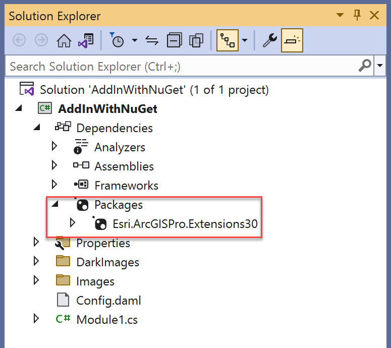 In your Solution Explorer in Visual Studio, expand the Dependencies > Packages node. Notice that the Esri.ArcGISPro.Extensions is now listed as a NuGet reference.