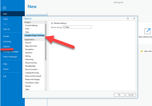 This guide will discuss defining custom Project and Application level settings using the Pro SDK. Project and Application settings can be accessed off the Options property page dialog, via Options on the Pro backstage.