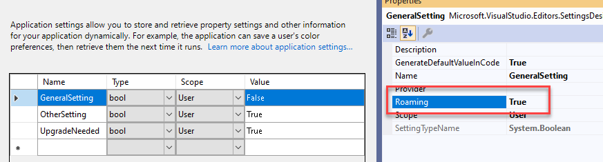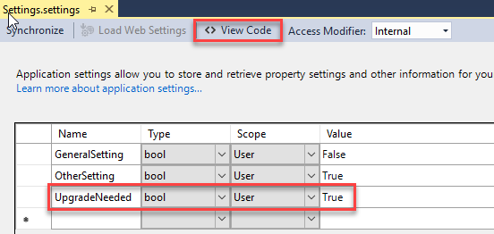 - Add an additional property of type "bool" called UpgradeNeeded. Set its default value to True. Be sure to set its Roaming property to True also.