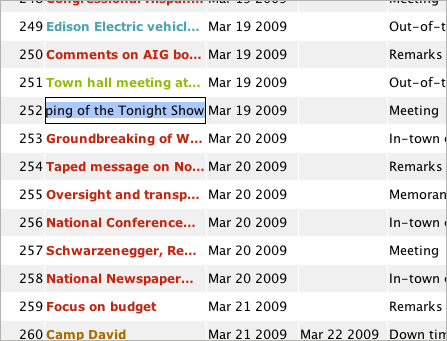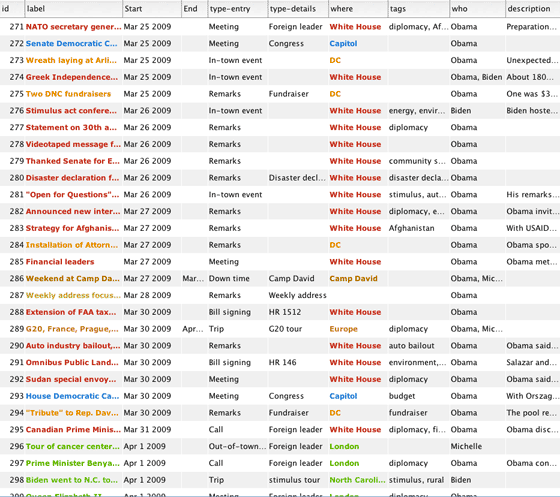 The table mode displays a straight forward, spreadsheet-like view of the data. It also keeps the color coding used in the timeline view (in the example below, color by location had been chosen in the timeline view and it carried over to the table).
