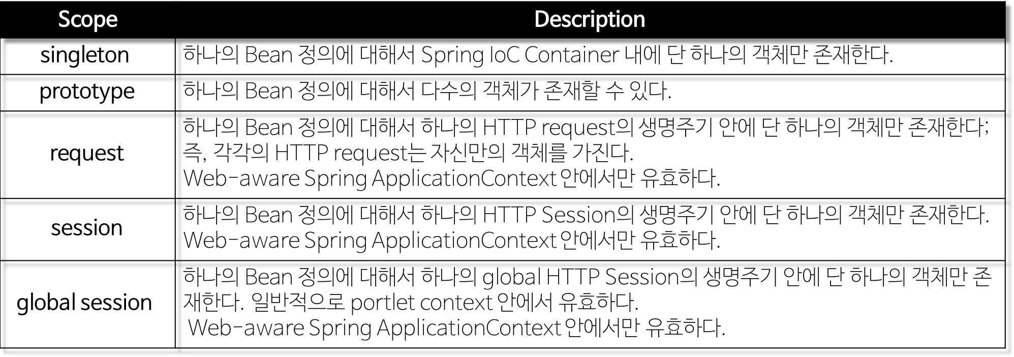 - scope: ๊ฐ์ฒด์ ๋ฒ์ (sigleton, prototype)