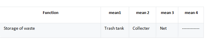 Function 1 1.Collecting waste. Function 2 1.Storing waste in the collector. Function 3 1.Swim’s on the water.