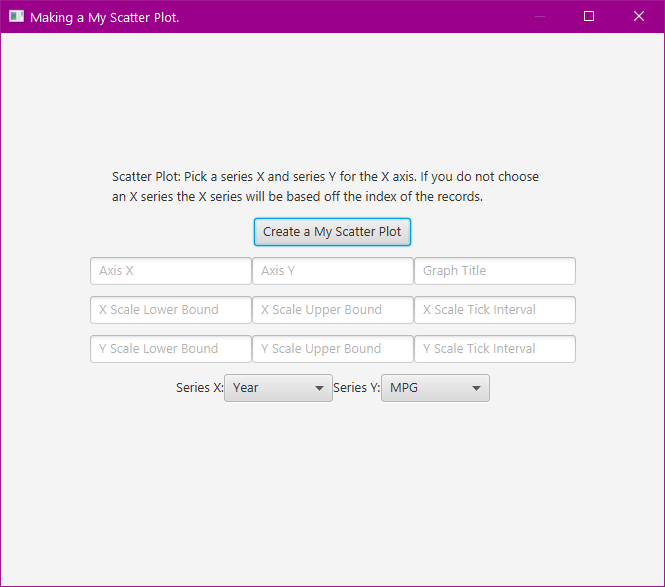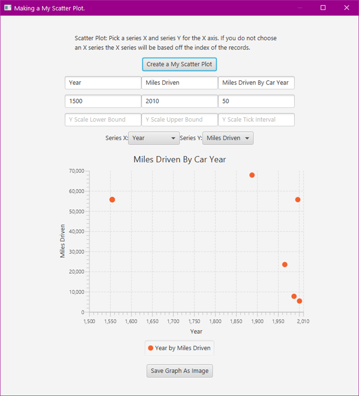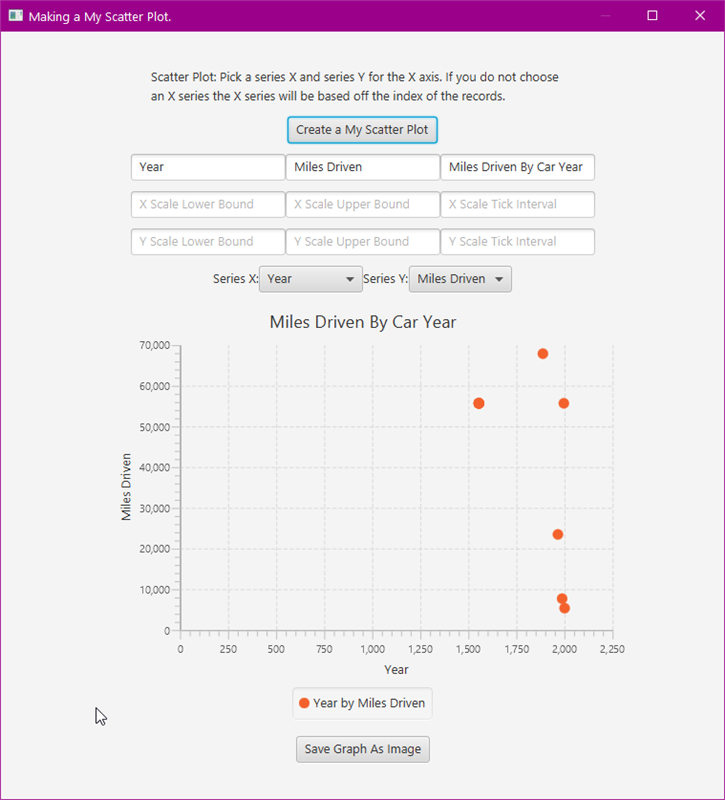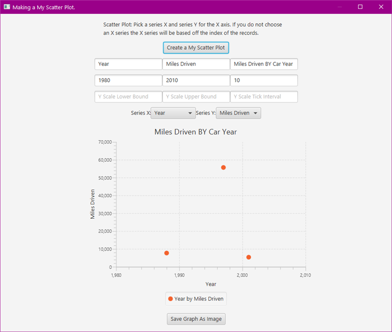 There's a whole lot on this screen now but lets just worry about the Series X and Y drop downs at the bottom, these will allow us to select what columns we want to use for our scatterplot. My data set is about Cars so I'll chose year by how miles the car has.
