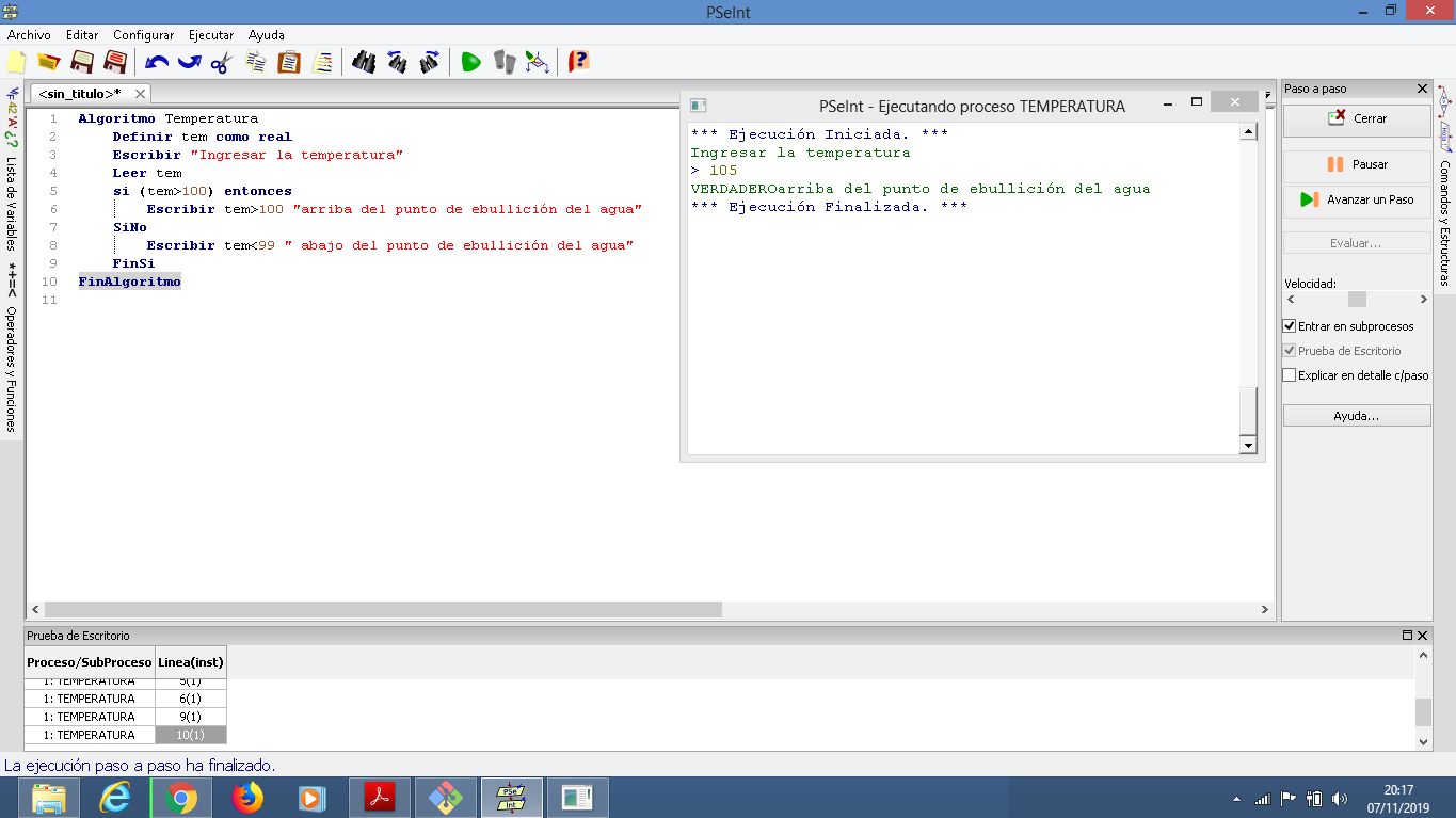 b) Si la temperatura está por encima de 100 grados, despliegue el mensaje “arriba del punto de ebullición del agua”; de lo contrario despliegue el mensaje “abajo del punto de ebullición del agua”.