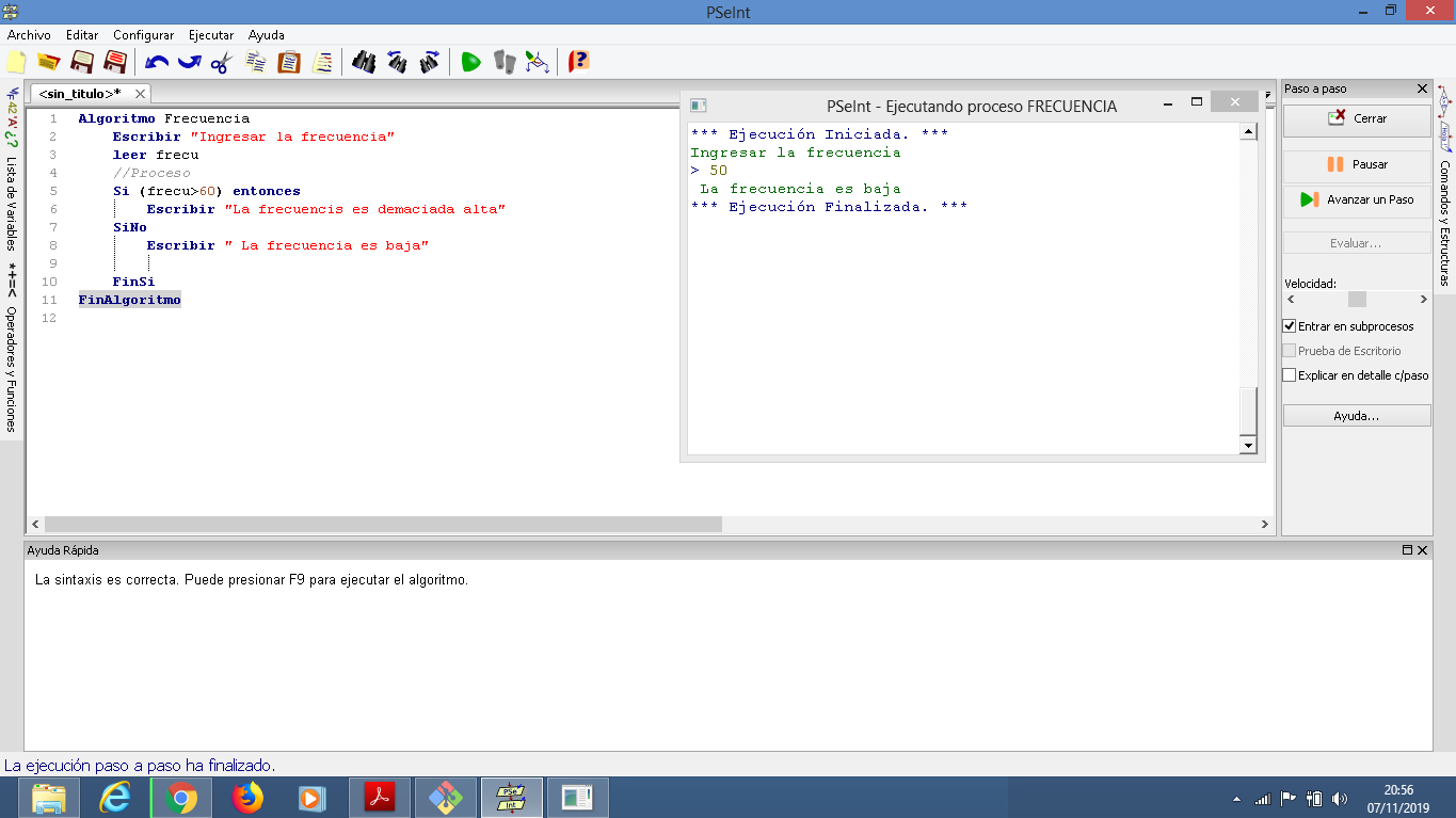 h) Si la frecuencia es superior a 60, despliegue el mensaje “La frecuencia es demasiado alta”.