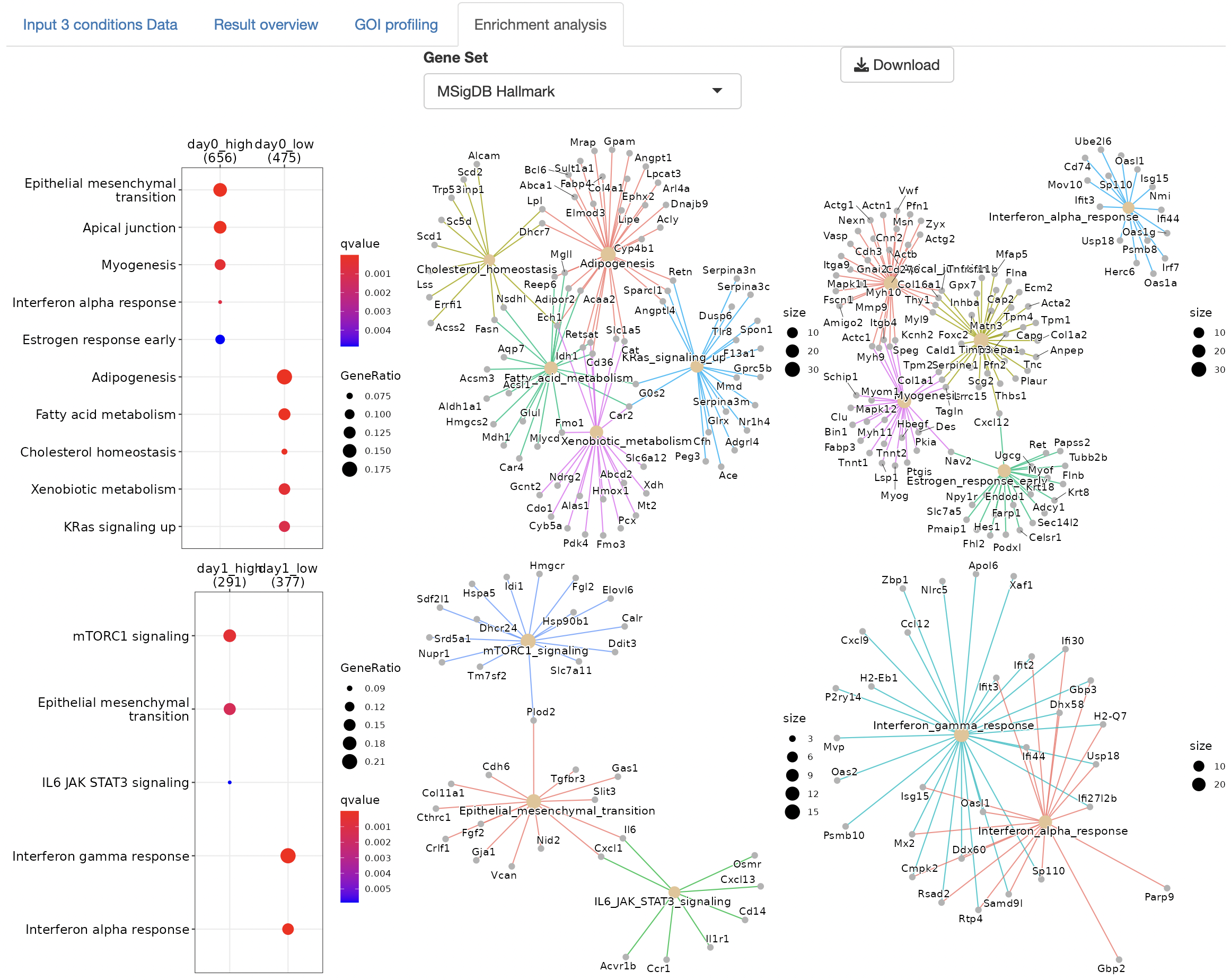 Dotplots and gene-concept network, cnet, plots are displayed as the result.