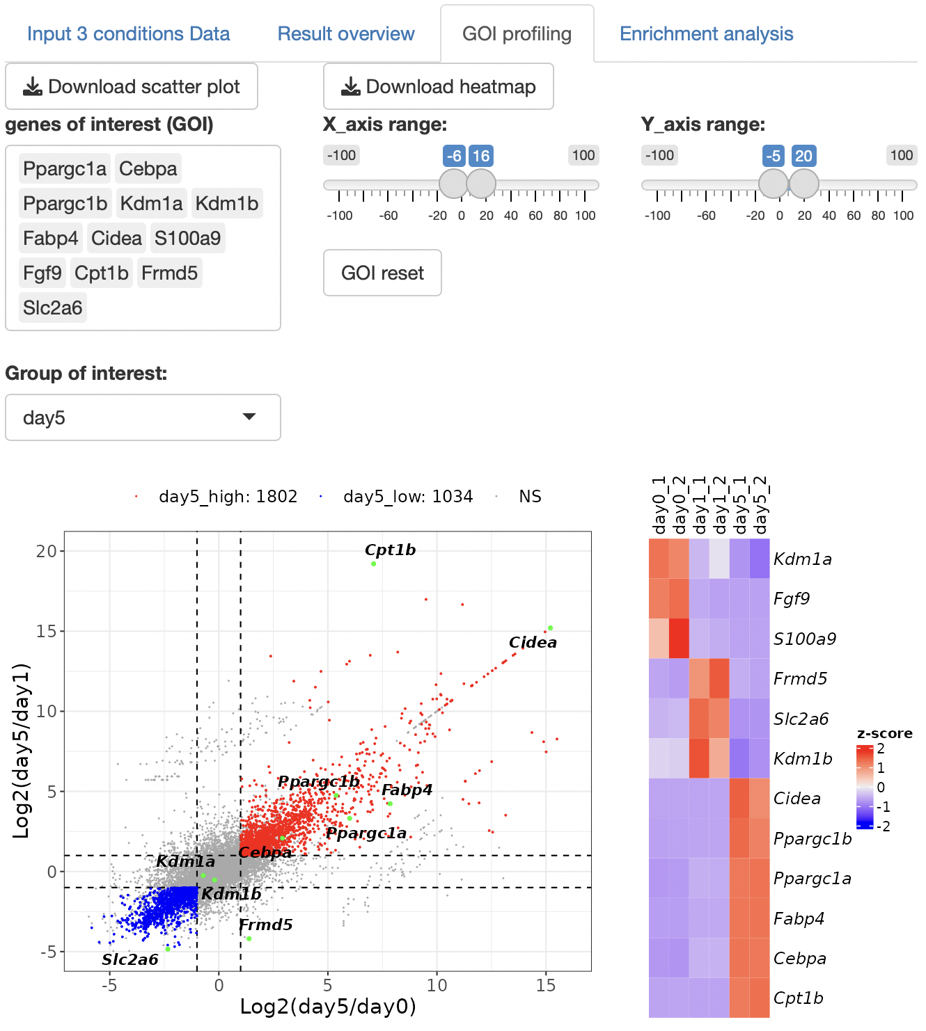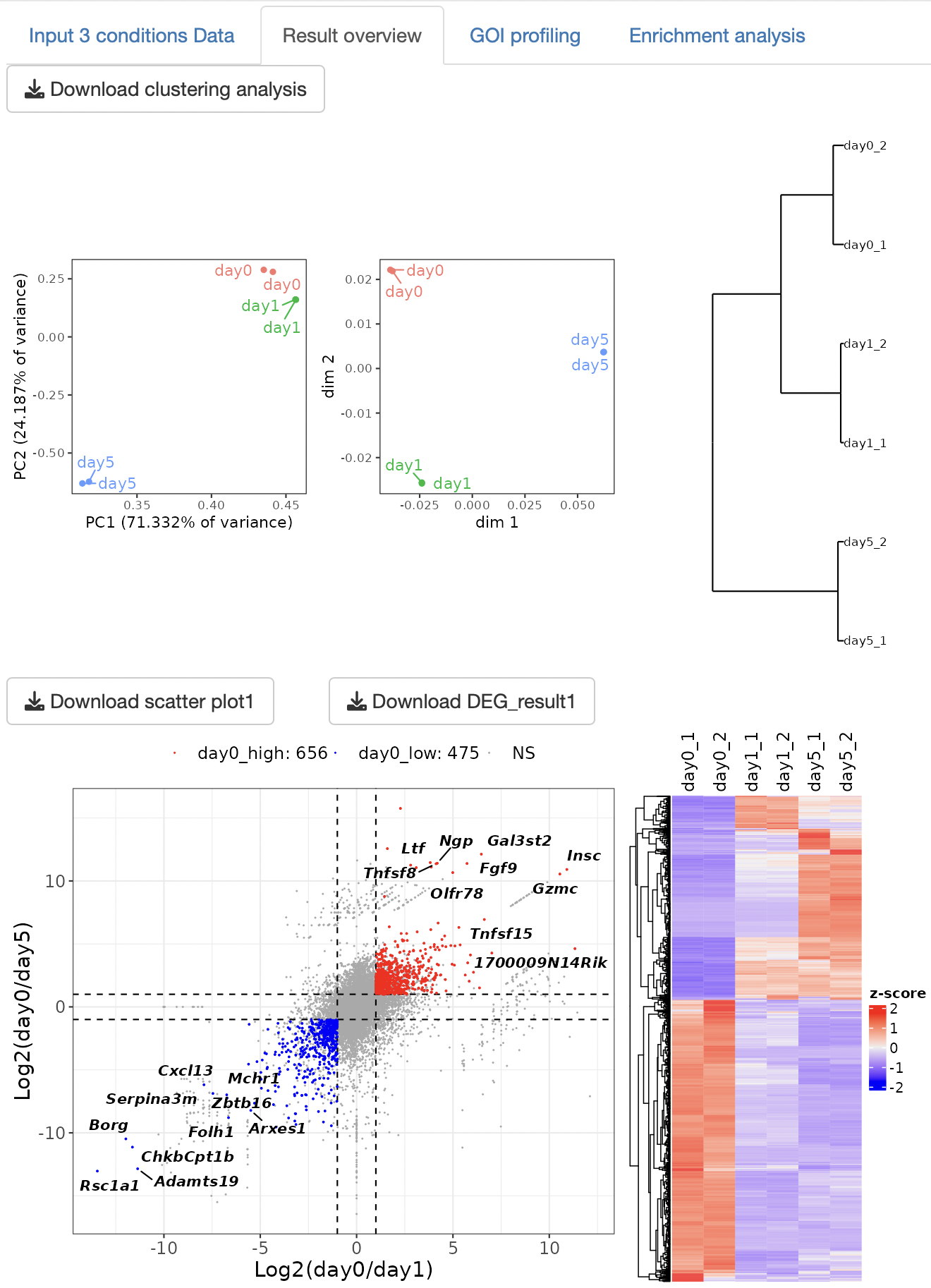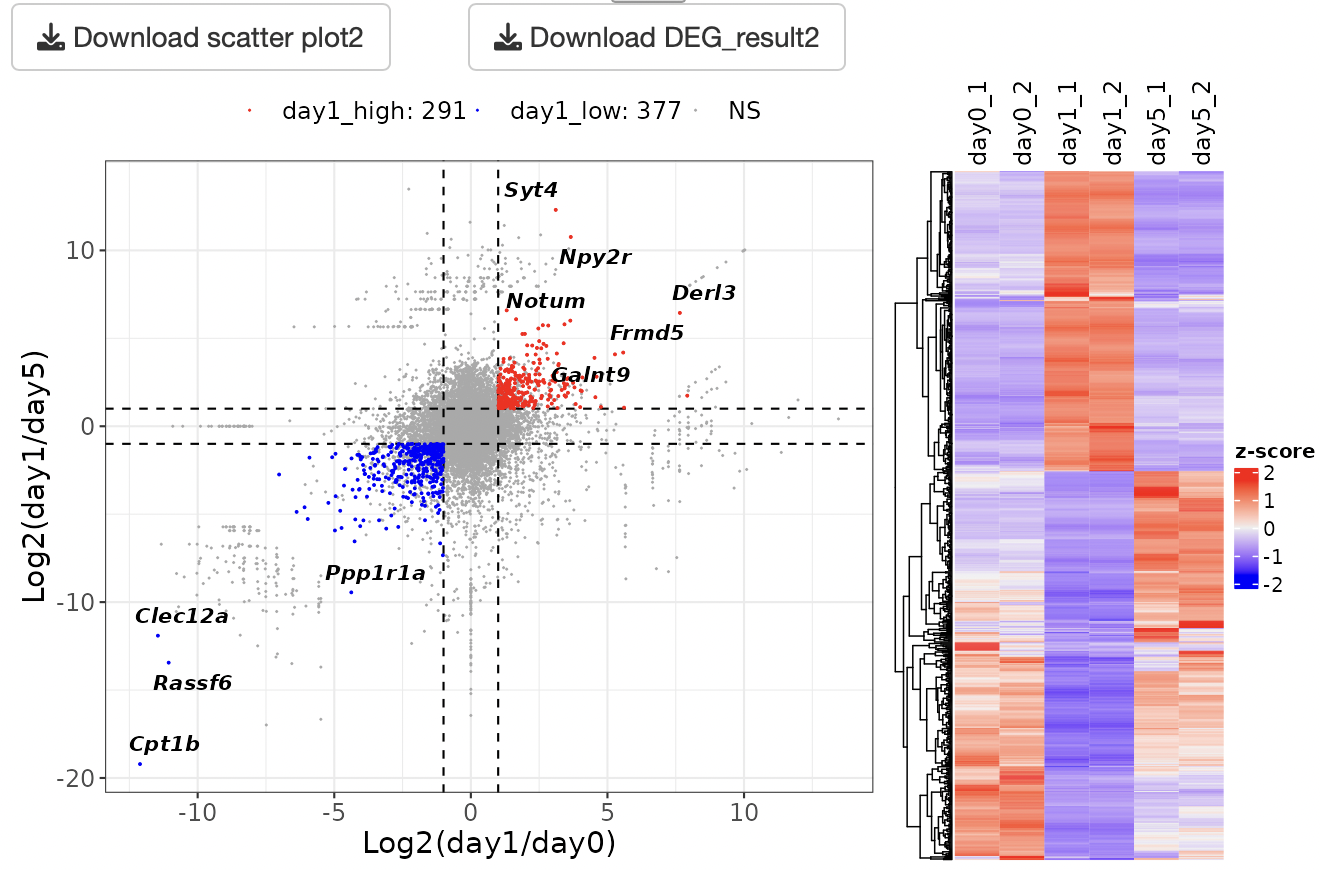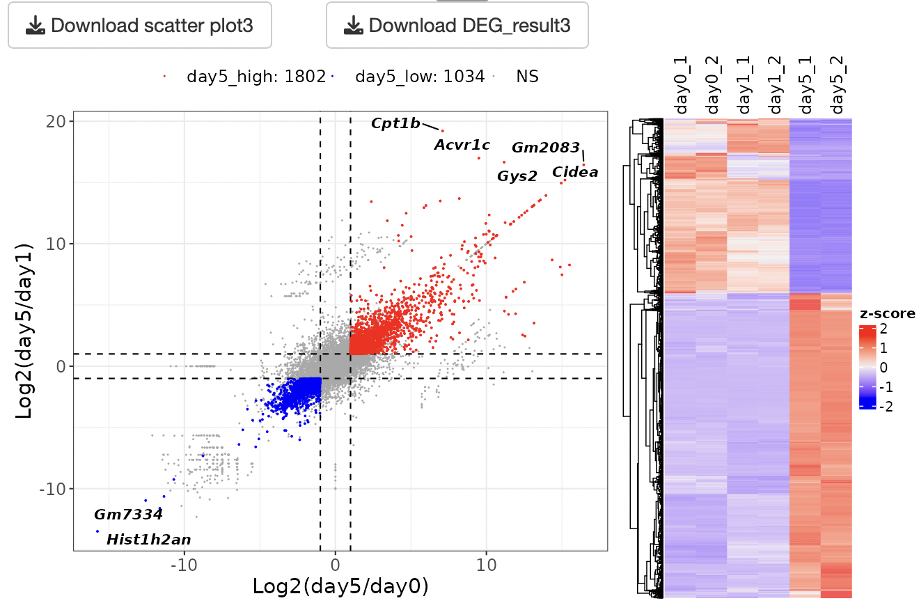 An EBSeq multi-comparison analysis is performed to detect the DEGs. Scatter plots and heatmaps are displayed as a result of the DEG analysis.