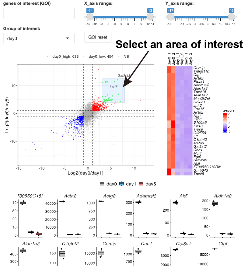 You can also select genes by drawing the box on the scatter plot.