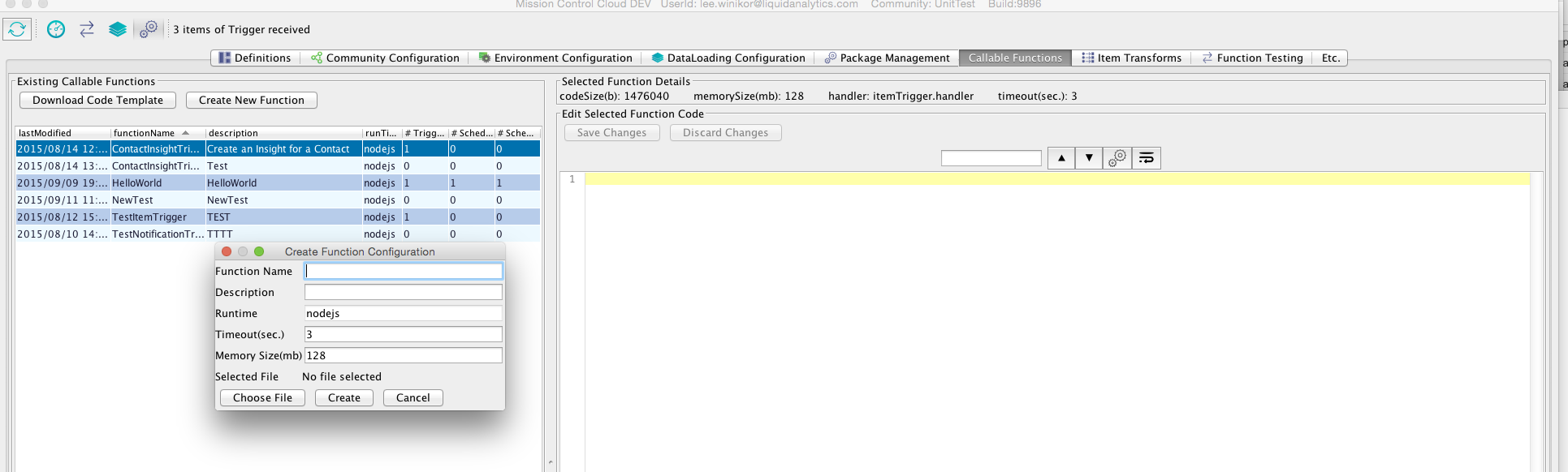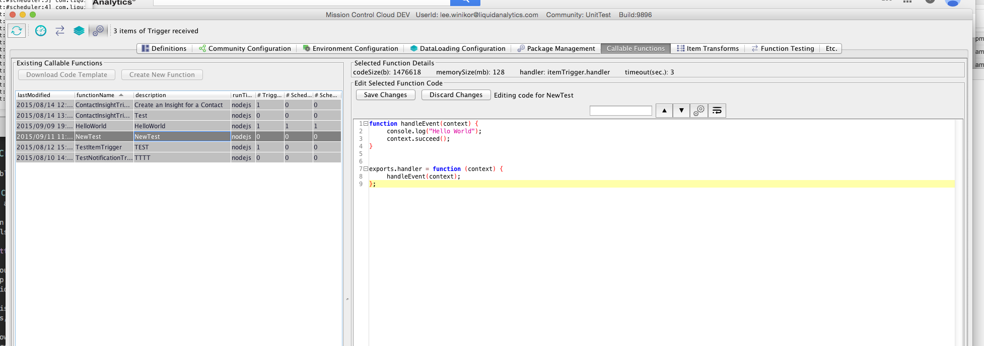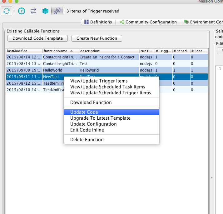 1. On the Callable Function panel in Mission Control, right click on the existing callable function you would like to modify, and hit "Edit Code Inline". This will download the existing code for the selected callable function, and display the contents of function.js in the text area to the right.