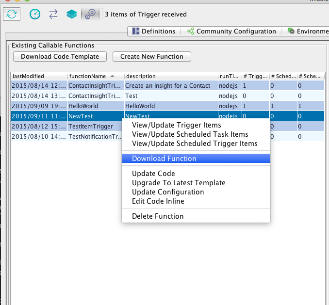 2. If you are more comfortable making changes in a javascript IDE, or you need to make changes to files other than function.js that you may have added during the development process, you can download the complete current code for your function by right clicking on the existing callable function and selecting "Download Function"
