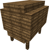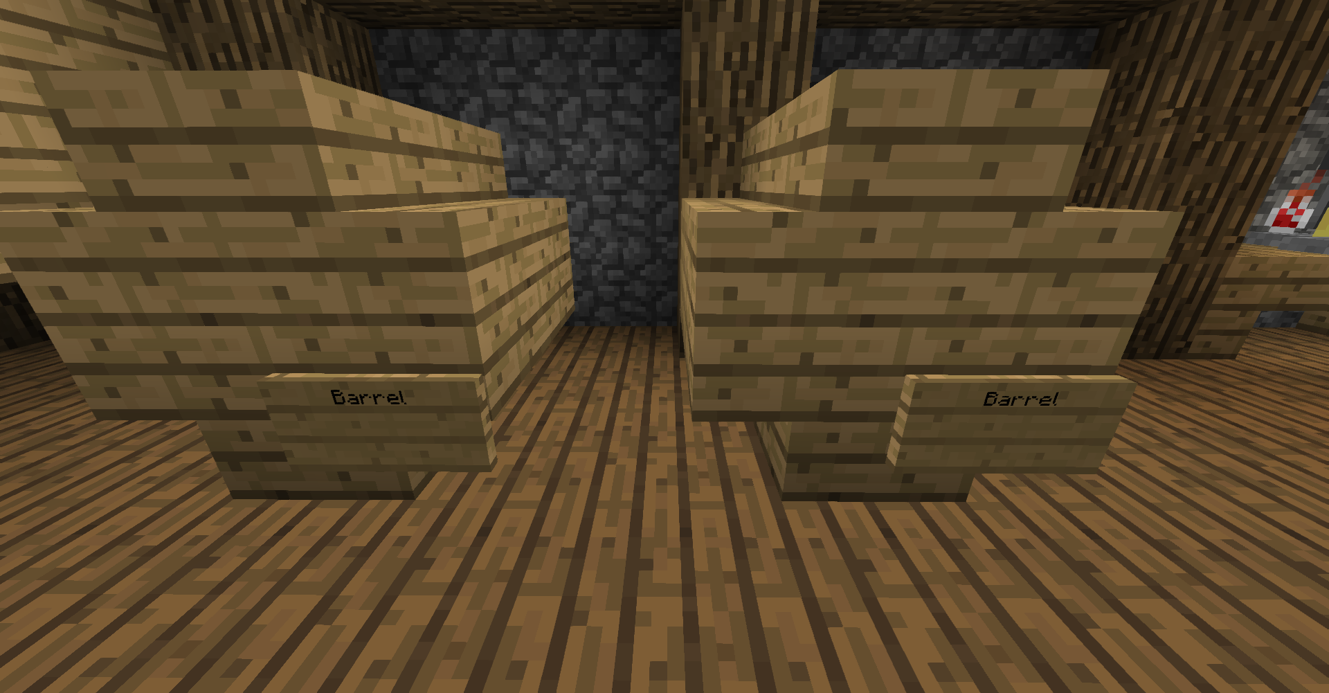 Use 5 Fences, 16 Wooden stairs, and 18 wood planks to build a barrel shape. Attach a Spigot (Fence) and a Sign that has "Barrel" written on it: