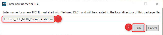 - Leave what it auto puts into the name (1) as in order to work it needs to match your DLC name and then click OK (2) (see Figure 27)