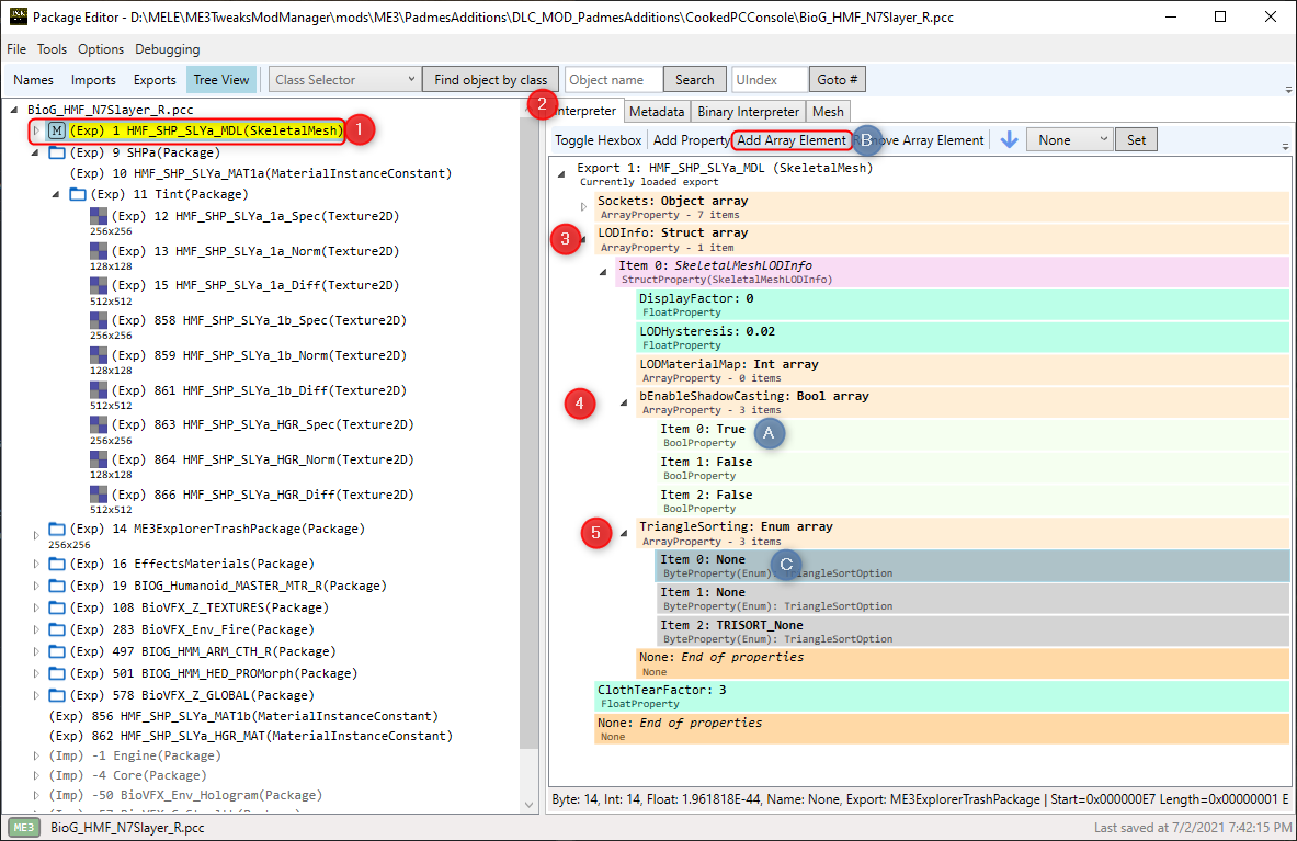 - For ME3OT/LE3 Click on (C) Item 0: TRISORT_None then (B) Add Array Element (there needs to be same amount as Materials)