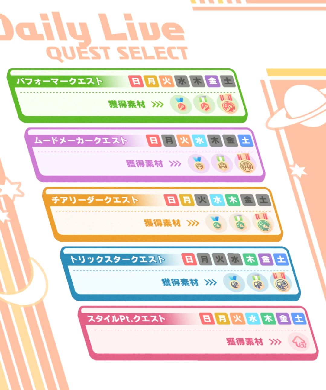 | Daily Live | Daily stages that grant materials to idolize and level up your cards. Not all stages are available for play at once. |