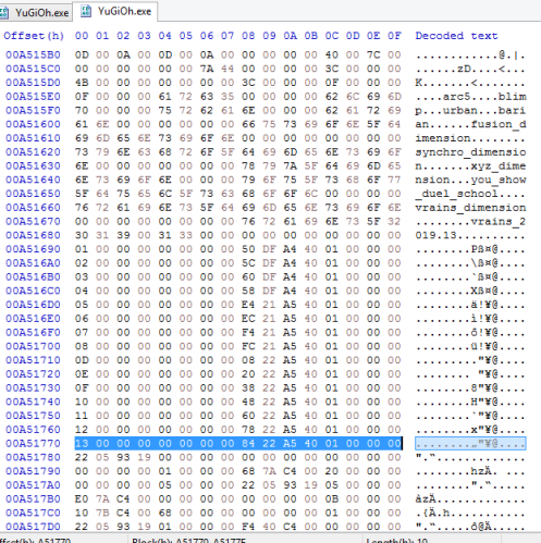 This is the new data for the new arena. Right after the Vrains 2019 text in my image, you can see that I wrote in ‘13’, this is the ID I am going to use for the new arena, to match the new arena ID. If you check the Arena ID page here, you will see that these values in my picture (the very first number in each row above the blue highlight) all correspond to the same ID’s. Here we will be adding a new arena with the ID of ‘13’, the 2nd part of the code I wrote, and the last 8 numbers of the 16 byte data for each arena entry, are memory addresses of where it is reading the arena data in memory when the game is running, so I pointed it directly to offset 0140A52284, wrote it backwards in hex so the exe can read it (84 22 A5 40 01) and now it is pointing to our new ID.