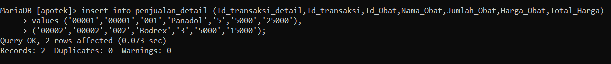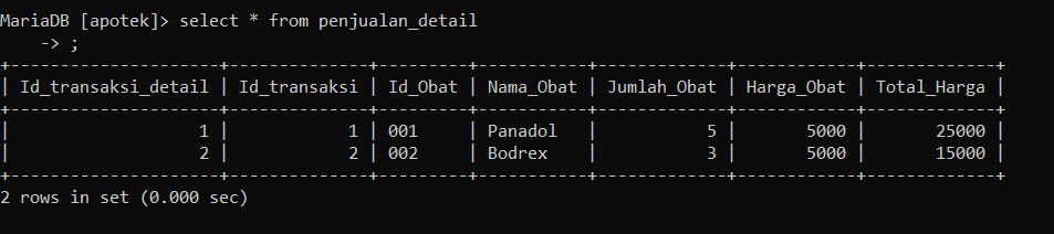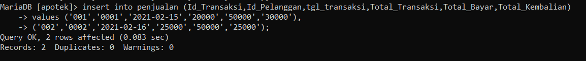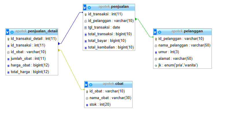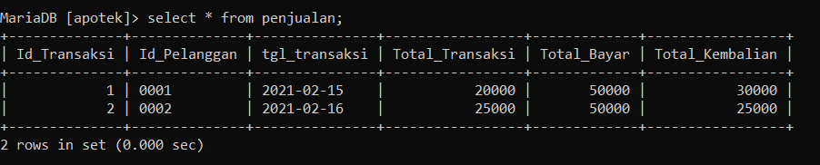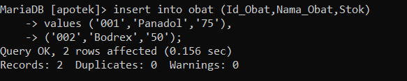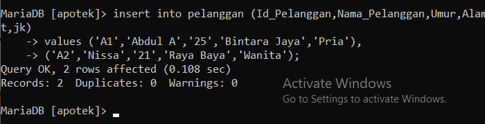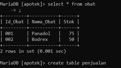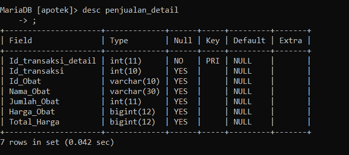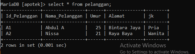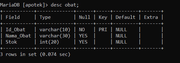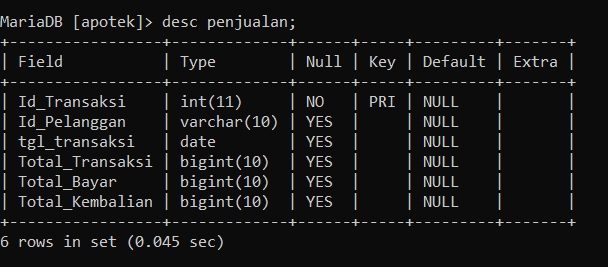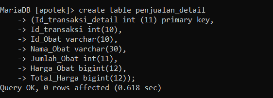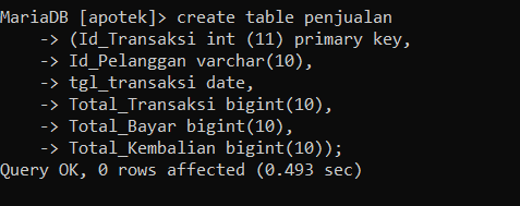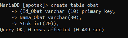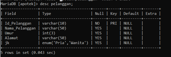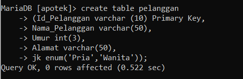 Pada syntak diatas saya membuat tabel dengan nama pelanggan pada database apotek. Struktur dari tabel mahasiswa yaitu terdapat 5 fields: