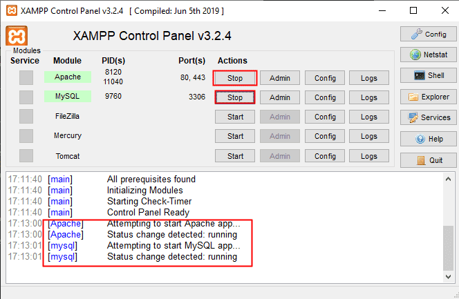 - Pada tutorial kali ini saya akan berfokus dulu membuat tabel dengan perintah query melalui cmd (Command Prompt). Untuk itu pertama kita perlu menginstall aplikasi xampp untuk memfasilitasi database mysql. Jika kalian belum mempunyai aplikasi tersebut silahkan install terlebih dahulu. Jika kalian sudah mempunyai aplikasi xampp langsung saja buka aplikasinya kemudian aktifkan module Apache dan MySQL dengan cara klik Start pada bagian actions.