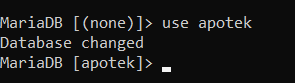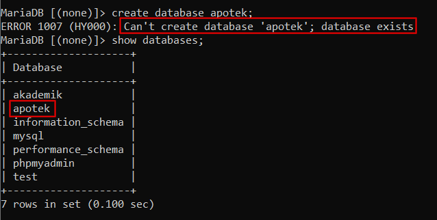 - Selanjutnya Kita Buat Database Terlebih Dahulu Dengan Ketik "create database (nama database),Nb:"Can't Create Database 'apotek'; database exists" Disini Saya Sudah Buat Database Maka Keterangan Seperti Itu, Ketik Show databases untuk mengecek databases yang sudah dibuat,