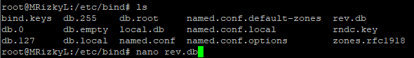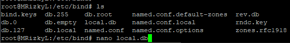 - Lalu lakukan backup file terlebih dahulu dengan cara mencopy file db.local & db.255. Copy dengan masukkan perintah cp db.local local.db & cp db.255 rev.db. Copy file dengan nama bebas, disini saya menggunakan nama local.db & rev.db. Setelah itu masuk ke perintah nano named.conf.local