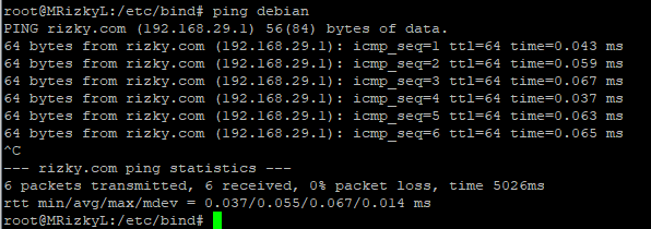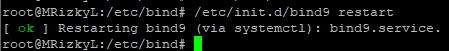 - Setelah selesai tahap pengeditan, lanjut untuk merestart paket bind9 dengan cara /etc/init.d/bind9 restart jika status ok berarti tidak ada yang salah.