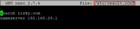 - Lanjut masuk kedalam perintah nano /etc/resolv.conf. Tambahkan seperti gambar dibawah. search dengan nama domain, nameserver dengan ip server. Kalau sudah save file tersebut.