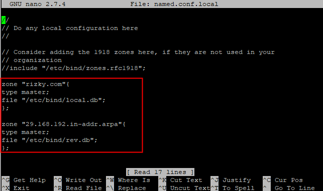 - Tambahkan tulisan seperti dibawah. Keterangan rizky.com itu adalah nama domainnya, 29.168.192 itu adalah IP Address yang diurutkan dari belakang, lokasi file sesuai dengan lokasi file yang tadi kita copy kan.